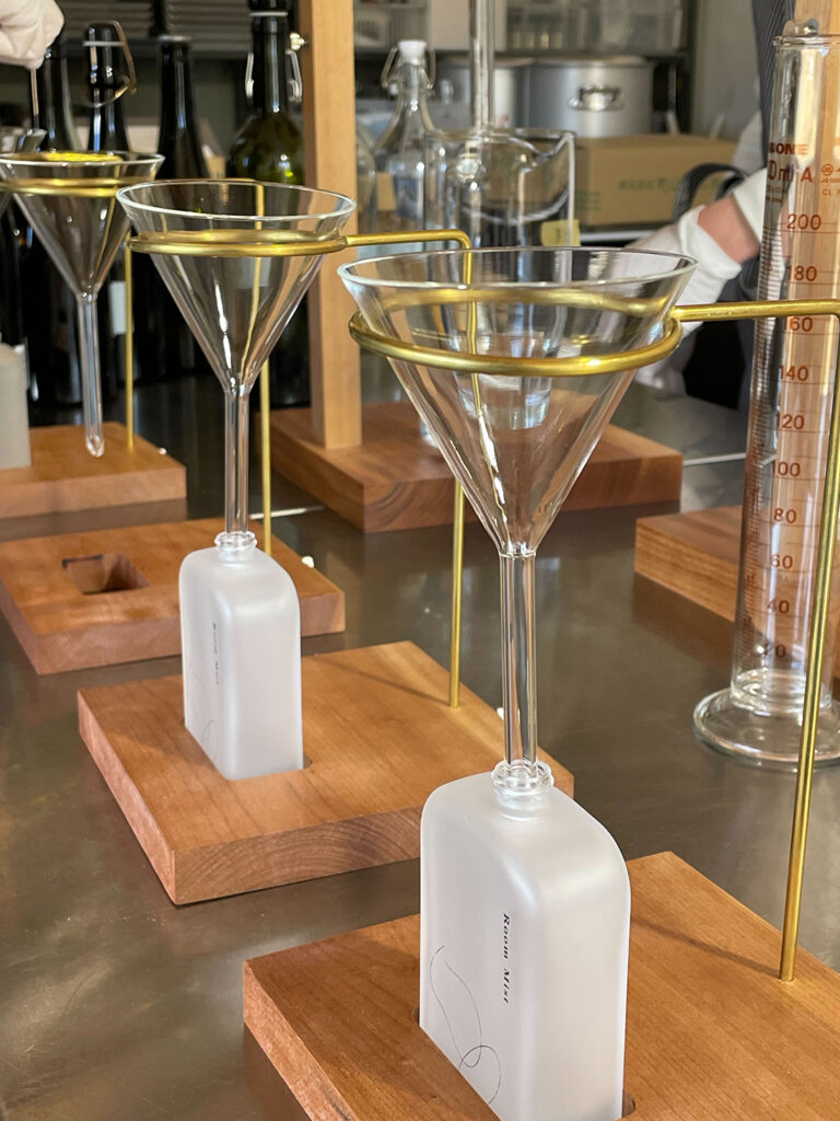 「香り」と「キャップ色」をお選びいただける完全受注生産のルームミストは、透明感と丸みのあるやわらかな香りに仕上げるために、約4週間の熟成と濾過の工程を経て香りを育てていきます。注文会からお渡しまでおよそ2ヶ月間弱。時が仕上げる、まろやかな香りをお楽しみください。
